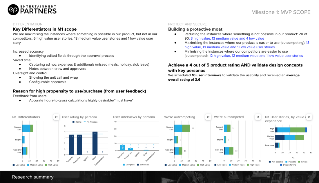 Conduct an assessment that looks at how well each user story is met by 1) our service and, 2) our competitors