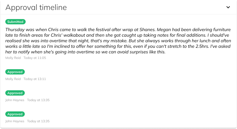 New way: The approval chain for each timesheet is visible, along with a colour-coded status to show pending and completed actions.