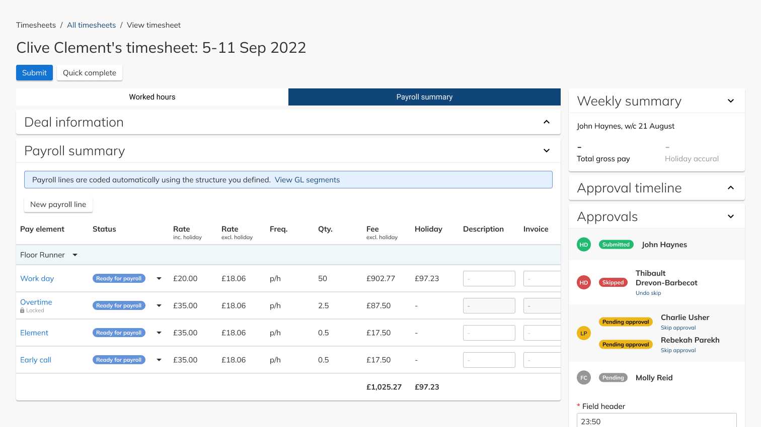 New way: Gross payments are calculated as timesheets are completed, meaning crew can invoice for the correct amount first time.